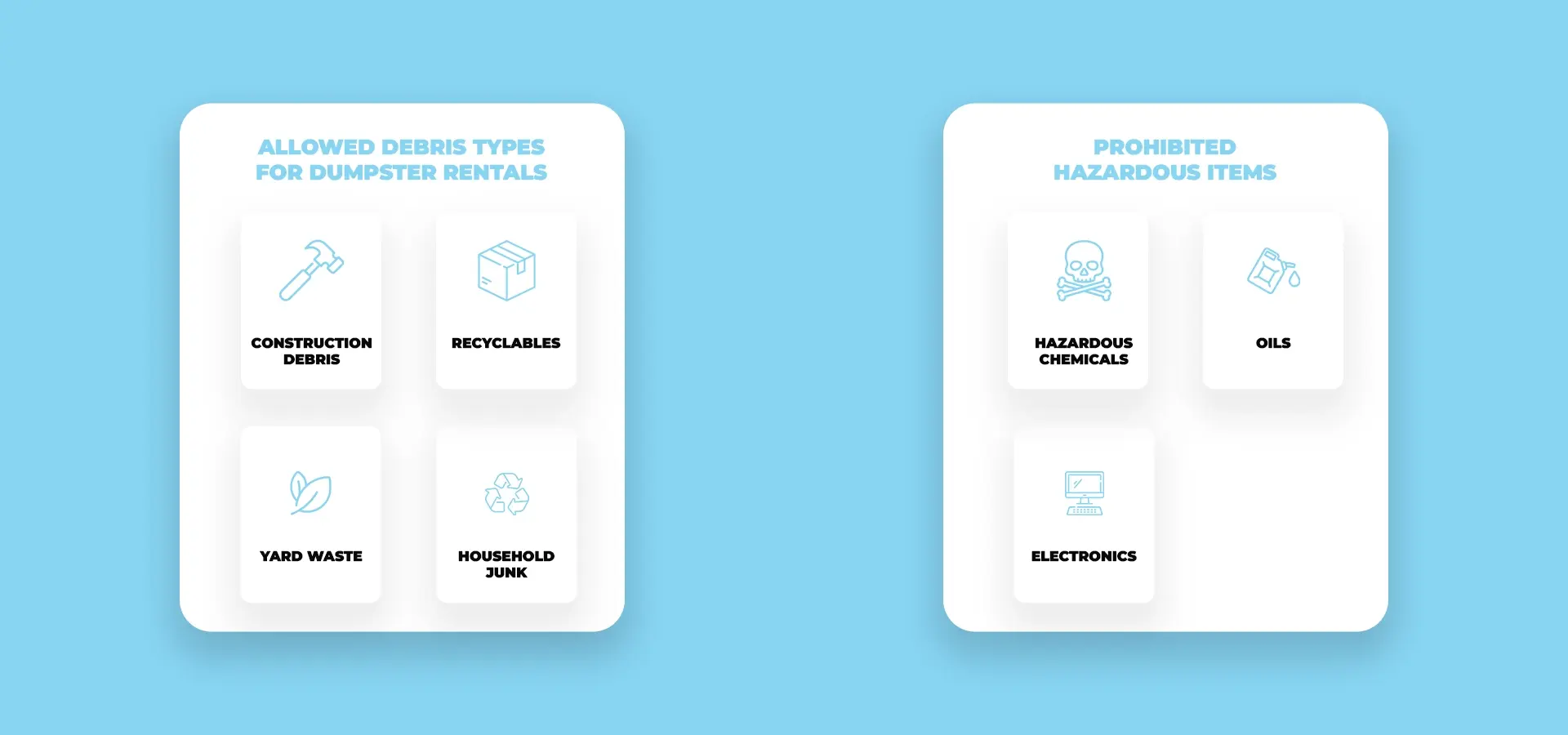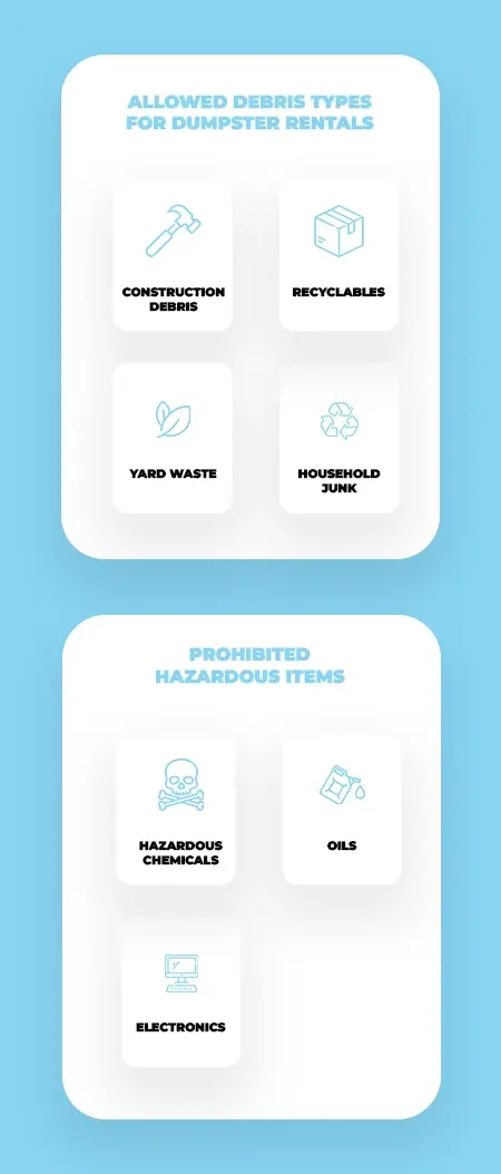 Debris guidelines may vary based on your location, local landfill regulations, and the type or size of dumpster you choose. Certain materials may require special handling or a specific dumpster size. Please check with us to confirm what's allowed for your project. To view available dumpster sizes and choose the right one, click here.